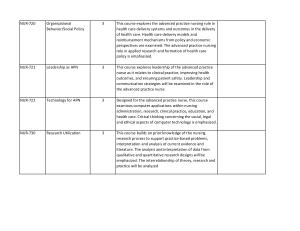 This course explores leadership of the advanced practice nurse as it relates to clinical practice , improving health outcomes , and ensuring patient safety . Leadership and communication strategies will be examined in the role of the advanced practice nurse . |