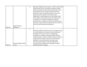 3 During the Applied Practice Experience ( APE ), public health professionals will act as preceptors and guide students while they apply the public health skills learned in their foundational courses . Students will work with their preceptor to plan and develop products of use to the practice location , whether a community based organization , health department or other public health site . Students are expected to select and demonstrate competency in at least 5 foundational or program competencies . In addition to the practical experience at their site , students will meet regularly online to reflect on their APE and professional development .