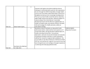 3 Qualitative research methods can help public health professionals better understand the lived experience of communities before , during and after implementation of health promoting interventions . Focus groups , observation , and semi-structured interviews are examples of qualitative methods used alone or with quantitative methods for research or programmatic evaluations . This course builds on the skills introduced in PUB-610 and PUB- 630 . Students will have the opportunity to apply what they learn through lecture and readings as they gain experience in collecting and analyzing qualitative data .