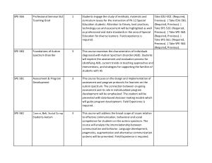 3 This course focuses on the design and implementation of assessment and program protocols for learners on the autism spectrum . The connection between on-going assessment and its role in individualized program development will be emphasized . The student will be presented with data-based decision-making models which will guide program development . Field Experience is required .