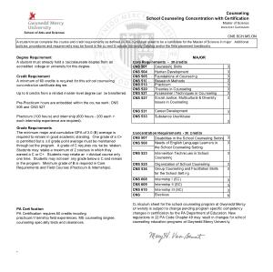 PA Certification PA Certification requires 60 credits incuding practicum / internship field experiences , MS counseling degree , counseling speciality tests and clearances .