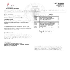 A student must complete the course and credit requirements as defined on this curriculum sheet to be a candidate for the PK-4 Certification . Additional policies , procedures and requirements may be found in the current Graduate University Catalog and / or Student Teaching Handbook .