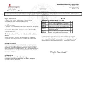 A student must complete the course and credit requirements as defined on this curriculum sheet to be a candidate for the Secondary Education Certification . Additional policies , procedures and requirements may be found in the current Graduate University Catalog and / or Student Teaching Handbook .