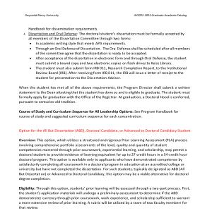 Overview : This option , which utilizes a structured and rigorous Prior Learning Assessment ( PLA ) process involving comprehensive portfolio assessments of the level , quality and quantity of student competencies mastered through prior coursework , experiential learning , and scholarship , may permit a doctoral student to provide evidence of learning equivalent for up to 27 credit hours in a 54-credit hour doctoral program . This option is available only to applicants who have demonstrated competence by satisfactorily completing all coursework in a doctoral program in education at an accredited college or university but have not completed the dissertation . For such students , typically designated as ABD ( All But Dissertation ) or Advanced to Doctoral Candidacy , this option may be a viable alternative for doctoral degree completion .