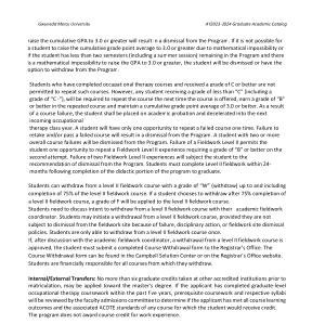 Students who have completed occupational therapy courses and received a grade of C or better are not permitted to repeat such courses . However , any student receiving a grade of less than “ C ” ( including a grade of “ C - ”), will be required to repeat the course the next time the course is offered , earn a grade of “ B ” or better in the repeated course and maintain a cumulative grade point average of 3.0 or better . As a result of a course failure , the student shall be placed on academic probation and decelerated into the next incoming occupational therapy class year . A student will have only one opportunity to repeat a failed course one time . Failure to retake and / or pass a failed course will result in a dismissal from the Program . A student with two or more overall course failures will be dismissed from the Program . Failure of a Fieldwork Level II permits the student one opportunity to repeat a Fieldwork Level II experience requiring a grade of “ B ” or better on the second attempt . Failure of two Fieldwork Level II experiences will subject the student to the recommendation of dismissal from the Program . Students must complete Level II fieldwork within 24- months following completion of the didactic portion of the program to graduate .