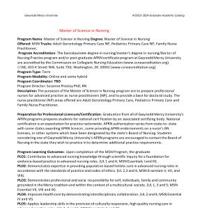 Program Name : Master of Science in Nursing Degree : Master of Science in Nursing Offered : MSN Tracks : Adult Gerontology Primary Care NP , Pediatrics Primary Care NP , Family Nurse Practitioner , Program Accreditation : The baccalaureate degree in nursing / master ’ s degree in nursing / Doctor of Nursing Practice program and / or post-graduate APRN certificate program at Gwynedd Mercy University are accredited by the Commission on Collegiate Nursing Education ( www . ccneacreditation . org ). CCNE ; 655 K Street NW , Suite 750 ; Washington , DC 20001 ( www . ccneacreditation . org ) Program Type : Term Program Modality : Online and some hybrid Program Coordinator : TBD Program Director : Suzanne Prestoy PhD , RN Description : The purposes of the Master of Science in Nursing program are to prepare professional nurses for advanced practice as nurse practitioners ( NP ), and to provide a base for doctoral study . The nurse practitioner ( NP ) areas offered are Adult Gerontology Primary Care , Pediatrics Primary Care and Family Nurse Practitioner .