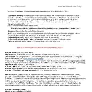 Program Name : MSN / MBA Dual degree Degree : Master of Science in Nursing and Master of Business Administration Accreditation : The MSN program at Gwynedd Mercy University is accredited by the Commission on Collegiate Nursing Education ( CCNE , www . ccneaccreditation . org ). The dual degree MSN / MBA is waiting for approval from the State Board of Nursing . The MBA program at Gwynedd Mercy University is accredited by the International Accreditation Council for Business Education ( IACBE , iacbe . org ). Degrees Offered : MSN / MBA dual degree Program Type : MSN courses are term based , MBA courses are non-term based Program Modality : MSN online with the exception of NUR 570 Assessment class ; MBA is fully online Program Coordinators : Suzanne Prestoy Ph . D . RN / Jill Winnington , D . B . A