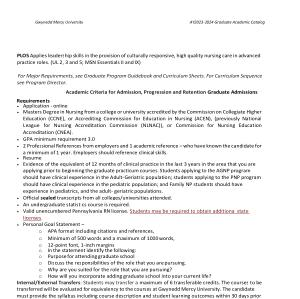 • Personal Goal Statement – o APA format including citations and references , o Minimum of 500 words and a maximum of 1000 words , o 12-point font , 1-inch margins o In the statement identify the following : o Purpose for attending graduate school o Discuss the responsibilities of the role that you are pursuing . o Why are you suited for the role that you are pursuing ? o How will you incorporate adding graduate school into your current life ? Internal / External Transfers : Students may transfer a maximum of 6 transferable credits . The courses to be transferred will be evaluated for equivalency to the courses at Gwynedd Mercy University . The candidate must provide the syllabus including course description and student learning outcomes within 30 days prior to the interview . ( Once the student is accepted no courses may be taken outside of Gwynedd Mercy University .)