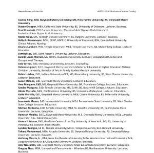 Joanne Kling , EdD , Gwynedd Mercy University ; MS , Holy Family University ; BS , Gwynedd Mercy University Stacey Knapper , MBA , California State University ; BS , University of Delaware . Lecturer , Business . Brad Kovoleski , PhD Gannon University , Master of Arts Slippery Rock University Bachelor of Arts Slipper Rock University Marie Kraus , MA , Fairleigh Dickson University ; BS , Rutgers University . Lecturer , Business . Kelly A . Kronemeyer , MSN , CRNP , AGPC-C , University of Cincinnati ; BSN , Cumberland University . Clinical Adjunct , Nursing . Charles Lambert , PhD , Temple University ; MEd , Temple University , BA , Muhlenberg College . Lecturer Education . Samuel Lee , EdD , Saint Joseph ’ s University ; Lecturer , Education . Janelle Lenzo-Werner , MS , OTR / L , Duquesne University . Lecturer , Occupational Science and Occupational Therapy . Jody Lerner , EdD , Immaculata University . Lecturer , Counseling . Rebecca Lippert , Ed . D . Gwynedd Mercy University Master or Education in Higher Education Abilene Christian University , Bachelor of Arts in Family Studies Messiah University