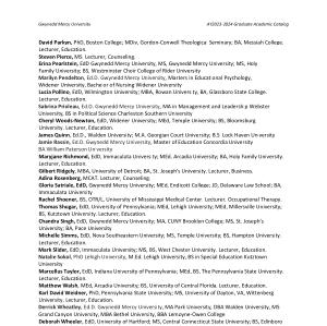 David Parkyn , PhD , Boston College ; MDiv , Gordon-Conwell Theological Seminary ; BA , Messiah College . Lecturer , Education . Steven Pierce , MS . Lecturer , Counseling . Erina Pearlstein , EdD Gwynedd Mercy University , MS , Gwynedd Mercy University ; MS , Holy Family University ; BS , Westminster Choir College of Rider University Marilyn Pendelton , Ed . D . Gwynedd Mercy University , Masters in Educational Psychology , Widener University , Bachelor of Nursing Widener University Lucia Pollino , EdD , Wilmington University ; MBA , Rowan University , BA , Glassboro State College . Lecturer , Education . Sabrina Prioleau , Ed . D . Gwynedd Mercy University , MA in Management and Leadership Webster University , BS in Political Science Charleston Southern University Cheryl Woods-Newton , EdD , Widener University ; MEd , Temple University ; BS , Bloomsburg University . Lecturer , Education . James Quinn , Ed . D ., Walden University ; M . A . Georgian Court University ; B . S . Lock Haven University Jamie Rassin , Ed . D . Gwynedd Mercy University , Master of Education Concordia University BA William Paterson University Maryjane Richmond , EdD , Immaculata University ; MEd , Arcadia University ; BA , Holy Family University . Lecturer , Education . Gilbert Ridgely , MBA , University of Detroit ; BA , St . Joseph ' s University . Lecturer , Business . Adina Rosenberg , MCAT . Lecturer , Counseling . Gloria Satriale , EdD , Gwynedd Mercy University ; MEd , Endicott College ; JD , Delaware Law School ; BA , Immaculata University Rachel Shoener , BS , OTR / L , University of Mississippi Medical Center . Lecturer , Occupational Therapy . Thomas Shugar , EdD , University of Pennsylvania ; MEd , Lehigh University ; MEd , Millersville University ; BS , Kutztown University . Lecturer , Education . Chandra Singh , EdD , Gwynedd Mercy University ; MA , CUNY Brooklyn College ; MS , St . Joseph ’ s University ; BA , Pace University Michelle Simms , EdD , Nova Southeastern University ; MS , Temple University ; BS , Hampton University . Lecturer , Education . Mark Slider , EdD , Immaculata University ; MS , BS , West Chester University . Lecturer , Education . Natalie Sokol , PhD Lehigh University , M . Ed . Lehigh University , BS in Special Education Kutztown University Marcellus Taylor , EdD , Indiana University of Pennsylvania ; MEd , BS , The Pennsylvania State University . Lecturer , Education . Matthew Walsh , MEd , Arcadia University ; BS , University of Central Florida . Lecturer , Education . Karl David Weidner , PhD , Pennsylvania State University ; MS , University of Dayton , VA , Wittenberg University . Lecturer , Education . Derrick Wheatley , Ed . D . Gwynedd Mercy University , MA Park University , DBA Walden University , MS Grand Canyon University , MBA Bethel University , BBA Lemoyne-Owen College Deborah Wheeler , EdD , University of Hartford ; MS , Central Connecticut State University ; BS , Edinboro University of Pennsylvania . Lecturer , Education . Sheena Wilson , Ed . D . Grand Canyon University , MS Cabrini University , MS St . Joseph ’ s University , BS West Chester University Pamela Woodland , MS , Gwynedd Mercy University ; BS , Gwynedd Mercy University , AS , Gwynedd Mercy University . Lecturer , Business . Laurie Zickler , EdD , Seton Hall University ; MA , Monmouth University ; MA , State University of New York ; BA , East Stroudsburg University . Lecturer .