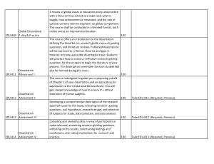 This course offers an introduction to the dissertation : defining the dissertation , research goals , research guiding questions , and literature reviews . Published dissertations will be explored to reflect on theories and gaps in theories to frame a possible dissertation topic . Students will practice how to construct effective research guiding questions for those topics to begin the literature review process . The dissertation committee for each student will also be formed during this cours