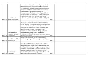 Considerations of school boardsmanship , internal and external governance , and structures in K-12 education . The course explores analysis the politics of school district governance and the leadership practices necessary to effectively lead in complex relationships . The characteristics of effective boardsmanship are defined through research and best practice . Twenty ( 20 ) hours of embedded field experience are required for those seeking the superintendent of school ' s letter of eligibility .