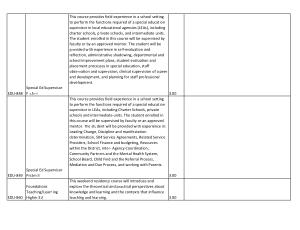 This course provides field experience in a school setting to perform the functions required of a special education supervisor in LEAs , including Charter Schools , private schools and intermediate units . The student enrolled in this course will be supervised by faculty or an approved mentor . The student will be provided with experience in : Leading Change , Discipline and manifestation determination , 504 Service Agreements , Related Service Providers , School Finance and budgeting , Resources within the District , Inter- Agency Coordination , Community Partners and the Mental Health System , School Board , Child Find and the Referral Process , Mediation and Due Process , and working with Parents .