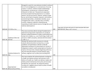 This course examines ethical concepts foundational to advanced nursing practice . Application of a variety of decision making frameworks to address ethical dilemmas arising from complex care , use of technology , health care resources , health care policy , national and international health issues . 3.00 Develop the statistical skills necessary to critically evaluate advanced practice nursing research using qualitative and quantitative methods to identify appropriate techniques for interpretation of results of independent research , and for presentation of results to improve clinical practice . Develop beginning proficiency for performing the analysis of clinical datasets using software programs such as SPSS , Excel and SAS / STAT .