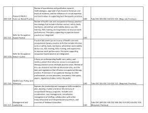Review of health care and occupational therapy practice terminology that include infection control , safety , body mechanics , wheelchair and mobility device use , ADL training , IADL training , and ergonomics to improve work performance . Principles supporting occupation-based practice are integrated .