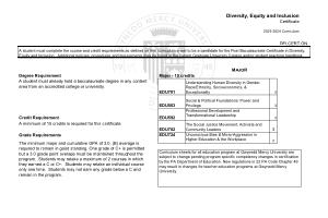 A student must complete the course and credit requirements as defined on this curriculum sheet to be a candidate for the Post Baccalaureate Certificate in Diversity , Equity and Inclusion . Additional policies , procedures and requirements may be found in the current Graduate University Catalog and / or student teaching handbook .