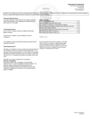 A student must complete the course and credit requirements as defined on this curriculum sheet to qualify for the Letter of Eligibility for the Superintendent of Schools . Additional policies , procedures and requirements may be found in the current Graduate University Catalog .