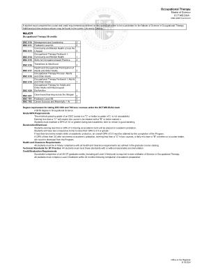 A student must complete the course and credit requirements as defined on this curriculum sheet to be a candidate for the Master of Science in Occupational Therapy . Additional policies and procedures may be found in the current University Catalog .