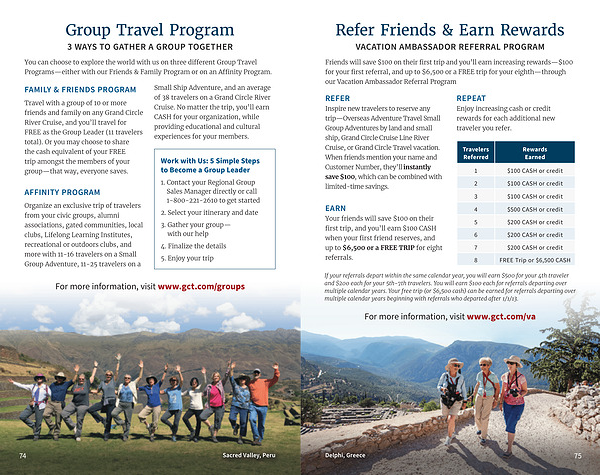 You can choose to explore the world with us on three different Group Travel Programs — either with our Friends & Family Program or on an Affinity Program .