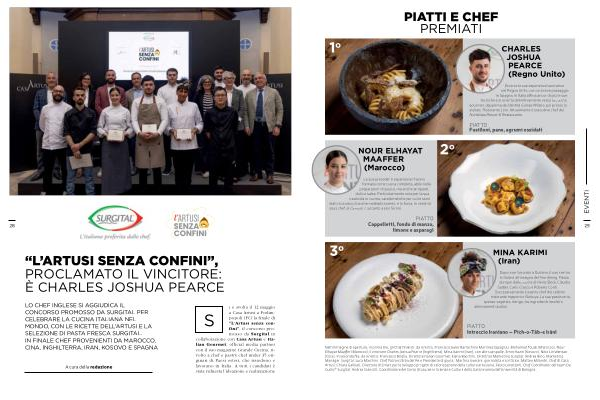 Nell ' immagine di apertura, in prima fila, gli Chef finalisti: da sinistra, Francisco Javier Barrachina Martinez( Spagna), Mohamed Touali( Marocco), Nour Elhayat Maaffer( Marocco), il vincitore Charles Joshua Pearce( Inghilterra), Mina Karimi( Iran), con alle sue spalle, Emin Haziri( Kosovo), Niko Lin Wentao( Cina). In seconda fila, da sinistra: Francesco Briglia, Direttore Italian Gourmet; Elena Bacchini, Direttrice Marketing Surgital; Andrea Bino, Marketing Manager Surgital; Luca Marchini, Chef Patron L’ Erba del Re e Presidente di giuria; Martina Liverani, giornalista e scrittrice; Matteo Milandri, Chef di Casa Artusi; Chiara Galbiati, Direttore di Smart per lo sviluppo progetti di valorizzazione della cultura artusiana; Fabio Lorenzoni, Chef Coordinator del team De Gusto ® Surgital; Andrea Gianotti, Coordinatore del Corso di Laurea in Scienze e Cultura della Gastronomia dell’ Università di Bologna.