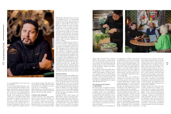 po’ sgangherato. « In effetti, ci siamo trovati tra matti. Entravo in cucina con secchiate di erbe che lui magari conosceva ma non praticava, tipo la porcellana di mare, il farinaccio( parente medievale della quinoa), il finocchio di mare di cui già parlava Senofonte, e poi l’ erba stellaria, la silene, la linula che cura anche i dolori. Tutte sfumature di un unico universo vegetale con doppia valenza: arricchire piatti poveri e curare. Gli uomini le consideravano erbacce e le estirpavano. È grazie alle donne che la tradizione è continuata, col bel risultato che le mettevano al rogo perché conoscevano il potere salvifico delle piante. In tempi in cui gli uomini mandavano via i vermi bevendo improbabili distillati, le donne usavano il santonico, che ingerito può essere tossico, ma utilizzato come cataplasma era un ottimo vermifugo anche per i bambini ». Dopo sette anni senza respiro, Daniele lascia il Vecio Fritolin per tirare il fiato, concedendosi prima una consulenza e poi un passaggio al Baglioni. Lo stesso ha fatto Irina, che ha chiuso il ristorante in tempo di Covid e oggi condivide esperienza e saperi con i ristoratori più giovani. La nuova casa di Zennaro si chiama Algiubagiò- acronimo delle iniziali dei soci fondatori- a Fondamente Nove, un bel mix di design e morbidezza, dove la cucina ha la |