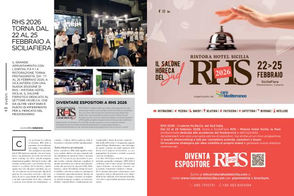 Essere espositori a RHS 2026 significa entrare in contatto diretto con una comunità solida e fidelizzata di operatori, buyer e decision maker. È l’ occasione per presentare le proprie novità, costruire relazioni e ampliare il proprio network in un contesto specializzato. Grazie alla presenza di operatori della distribuzione, catene di fornitura, titolari di esercizi pubblici, ristoratori, pasticceri, albergatori e consulenti, ogni partecipazione diventa un investimento strategico orientato al risultato. Le aziende potranno scegliere tra stand preallestiti o superfici libere, completamente per- sonalizzabili e dotate di servizi a supporto. Alle spalle dell’ evento c’ è la garanzia organizzativa di Expo Mediterraneo, che nel tempo ha saputo costruire un solido rapporto di fiducia con le imprese del territorio, accompagnandone la crescita e creando occasioni concrete di sviluppo. Con oltre 300 brand coinvolti e un posizionamento geografico strategico, RHS 2026 si conferma come l’ unico salone del Sud Italia capace di riunire – in un unico contesto – innovazione, formazione, business e visione. Per le aziende interessate a partecipare come espositrici, tutte le informazioni sono disponibili sul sito ufficiale www. ristorahotelsicilia. com, dove è già possibile prenotare il proprio spazio.
