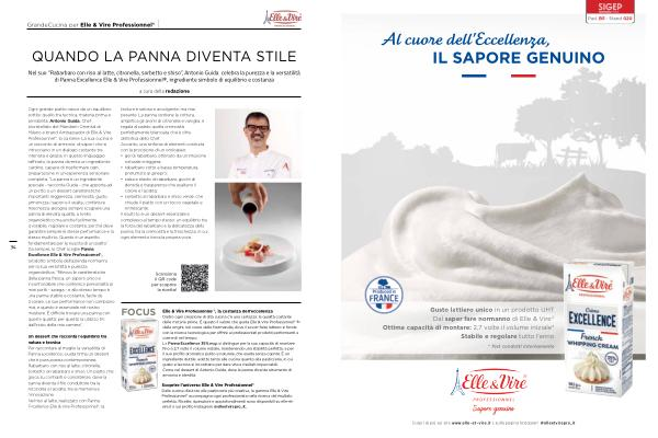 FOCUS Elle & Vire Professionnel ®, la costanza dell’ eccellenza Dietro ogni creazione di alta cucina c’ è una certezza: la qualità costante delle materie prime. È questo il valore che guida Elle & Vire Professionnel ® fin dalle origini, nel cuore della Normandia, dove il savoir-faire lattiero si fonde con la ricerca tecnologica per offrire ai professionisti prodotti performanti e coerenti nel tempo. La Panna Excellence 35 % m. g. si distingue per la sua capacità di montare fino a 2,7 volte il volume iniziale, mantenendo una stabilità perfetta, e per il suo profilo aromatico pulito e naturale, che esalta senza coprire. È un ingrediente duttile, adatto tanto alla cucina quanto alla pasticceria, in cui gusto e tecnica si incontrano per dare vita a risultati impeccabili. Come nel dessert di Antonio Guida, dove la panna diventa strumento di armonia e identità.
