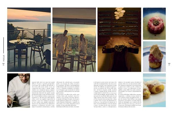 56 tamente dallo chef così come dai vegetali dell’ orto. Il pesce è grande protagonista, con il mare che si affaccia all’ orizzonte e che torna nelle ricette anche con le sue componenti più iodate e umami. Alghe, ostriche, ricci, compaiono spesso a supporto di una portata in carta e talvolta in accostamenti più dolciastri che sapidi. Grande protagonista della cucina di Davide Di Fabio è senza dubbio la frutta, in particolare in primavera e allo sbocciare della stagione estiva, con le sue migliori espressioni di stagione e non solo. Seppure la proposta in carta cambi senza rigidità temporali è nel percorso degustazione che ogni giorno appaiono e scompaiono referenze e passaggi. Un prodotto estemporaneo, un’ idea abbozzata che sottende già a un grande piatto, un esercizio di cotture, un gioco di consistenze. Di Fabio è profondamente indipendente nelle sue proposte andando spesso e volentieri a scardinare con pazienza ed eleganza quei momenti di comfort che saremmo soliti aspettarci nei ristoranti gastronomici. Un’ ouverture con albicocche acerbe cotte al forno, burro, sale, zucchero, olio al rosmarino e ricci di mare. Da buon abruzzese amante dell’ amaro( il gusto che fa parte della tradizione italiana per eccellenza secondo Massimo Montanari), i cappelli con olive amare, ricci e burro all’ arancia sono il risultato di una splendida riflessione. Identitaria la riflessione sul dolce, da aman-