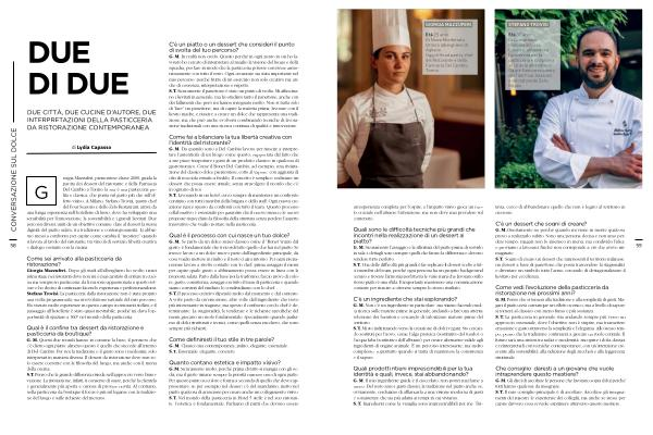 G. M. Onestamente no perché quando mi viene in mente qualcosa provo a realizzarlo subito. Sono una persona decisa e non amo perdere tempo: magari non lo inserisco in menu, ma condivido l’ idea, e proviamo a lavorarci finché non corrisponde a ciò che avevo immaginato. S. T. Sogno di creare un dessert che rappresenti il territorio milanese, un dessert a base di panettone che possa trascendere la stagionalità e diventare un simbolo tutto l’ anno, cercando di destagionalizzare il lievitato per eccellenza.