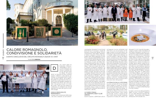 si protagonisti: Alessandro Trovato( Grand Hotel Da Vinci 5 * Cesenatico), Claudio Di Bernardo( Grand Hotel Rimini), Roberto Scarpelli( Palace Hotel Milano Marittima), le Azdore romagnole( Osteria Riccione Piadina), Milo Sintini( Agriturismo Il Gallo Rosso), Gian Luca Paganelli( Ristorante Teresina dal 1958), Fabrizio Barontini e Fabio Moriconi( MartinoRossi), Alberto Laterza( La Molisana), il pastry chef Mirko Montanari( Grand Hotel Da Vinci) e il bartender Flavio Allaria( Bulk Giancarlo Morelli Milano). Nelle isole di gusto gli chef hanno alternato la tradizione romagnola, con piatti del territorio dai sapori autentici, alla creatività della cucina d’ autore. Per accompagnare al meglio ogni piatto la mixology e un’ ampia selezione di vini. Due corner speciali: uno per le degustazioni, l’ altro per dolci e frutta fresca. Sul palco, Dario Colloi, direttore di Ristogolf, ha dato spazio a ospiti e saluti, in particolare la premiazione di un emozionato Marzio Montorfano, chef del Golf Club Carimate, come miglior buvette del Circuito Ristogolf 2025 by Allianz, e la divertente lotteria di beneficenza a favore della Fondazione Francesca Rava. Tra brindisi, musica e sorrisi, si è respirata l’ energia unica di Ristogolf, fatta di piacere della tavola e amicizia.