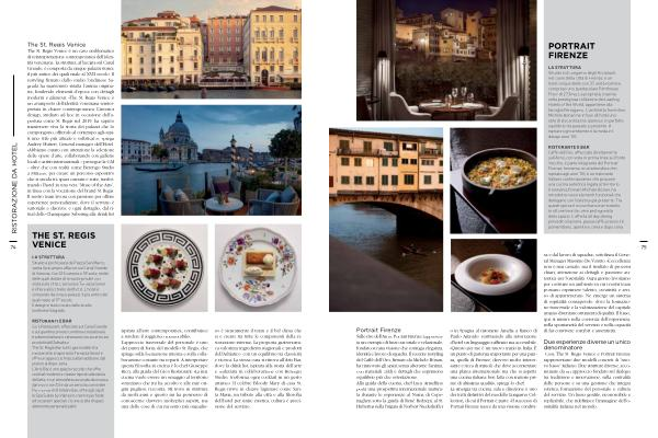 ispirata all’ arte contemporanea, contribuisce a rendere il soggiorno memorabile ». L’ approccio trasversale del personale è uno dei punti di forza del modello St. Regis, che spinge sulla formazione interna e sulla collaborazione costante tra reparti. A interpretare questa filosofia in cucina è lo chef Giuseppe Ricci, alla guida del Gio’ s Restaurant. « La mia cucina vuole essere un omaggio al territorio veneziano che mi ha accolto e alle mie origini pugliesi, racconta. Mi trovo in struttura da molti anni e questo mi ha permesso di conoscerne davvero molteplici aspetti, ma una delle cose di cui mi sento più orgoglioso è sicuramente il team e il bel clima che si è creato tra tutte le componenti della ristorazione interna ». La proposta gastronomica valorizza ingredienti stagionali e prodotti dell’ Adriatico, con un equilibrio tra classicità e ricerca. La stessa cura si ritrova all’ Arts Bar, dove la drink list, ispirata alla storia dell’ arte e realizzata in collaborazione con Berengo Studio, trasforma ogni cocktail in un gesto artistico. Il celebre Bloody Mary di casa St. Regis rivive in chiave lagunare come Santa Maria, un tributo alla città e alla filosofia dell’ hotel per unire estetica, cultura e precisione del servizio.