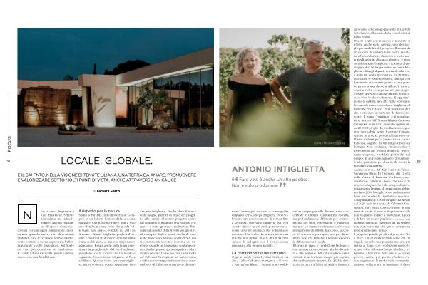 Antonio Intiglietta, che ha dato il nome della moglie, partner di vita e del progetto, alla tenuta. « Il nostro progetto nasce dal desiderio di riscattare una bellezza che spesso è stata ignorata o maltrattata. Pensiamo al disastro della Xylella per gli ulivi, ad esempio ». L’ idea non è quella di inseguire mode o scorciatoie commerciali, ma di costruire un racconto coerente del territorio, usando un linguaggio contemporaneo. Anche quando questo significa andare controcorrente. Come nel caso della scelta del Cabernet Sauvignon, un famosissimo e diffusissimo vitigno internazionale, come simbolo. « Il Cabernet ci permette di espri-