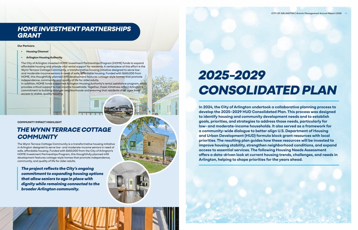The City of Arlington invested HOME Investment Partnerships Program( HOME) funds to expand affordable housing and provide vital rental support for residents. A centerpiece of this effort is the Wynn Terrace Cottage Community, a transformative housing initiative designed to serve lowand moderate-income seniors in need of safe, affordable housing. Funded with $ 650,000 from HOME, this thoughtfully planned infill development features cottage-style homes that promote independence, community, and quality of life for older adults. In addition, HOME funds supported Arlington Housing Authority’ s rental assistance program, which provides critical support to low-income households. Together, these initiatives reflect Arlington’ s commitment to building stronger neighborhoods and ensuring that residents of all ages have access to stable, quality housing.