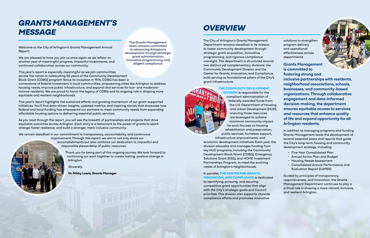 The City of Arlington’ s Grants Management Department remains steadfast in its mission to foster community development through strategic grant acquisition, innovative programming, and rigorous compliance oversight. The department is structured around two distinct yet complementary divisions: the Community Development Division and the Center for Grants, Innovation, and Compliance, both serving as foundational pillars of the City’ s grant infrastructure.