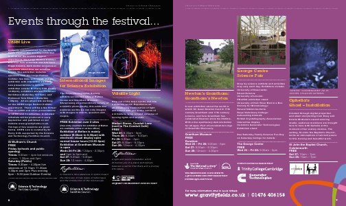 G R AV I T Y F I E L D S F E S T I VA L Events through the festival... CERN Live Uniquely commissioned for the Gravity Fields Festival this exciting exhibition is all about the world’s biggest experiment, the Large Hadron Collider. Discover how scientists use it to hunt Higgs bosons, dark matter and answer questions about how our universe began. The exhibition includes speakers from the Large Hadron Collider, live links with CERN and an exhibition with interactive elements. Live presentations to include exhibition curator Dr Harry Cliff (Friday 12.00pm), exhibition advisor Professor Val Gibson (Saturday 10.15am) and Professor Tara Shears (Saturday 1.30pm). All are physicists working on the CERN Large Hadron Collider experiment. There will be a live Virtual Tour of CERN and video presentations of CERN and its activities. A detailed schedule will be produced in early September and published on our website www.gravityfields.co.uk. Timings of live sessions are given below. CERN Live is curated by Dr Harry Cliff, supported by the Science and Technology Facilities Council. St Wulfram's Church FREE Friday (schools and public opening) Times: 9:30am – 4pm live sessions at noon, 1.30pm and 3pm Saturday (Public) Times: 9.30am – 4.30pm live sessions at 10.15am 11.30am 1.30pm and 3pm Plus evening 6pm – 9.30 (see Outdoor Events) 8 Hugh Turvey International Images for Science Exhibition The Royal Photographic Society exhibits across two sites at Belton House and Grantham Museum. Showcasing an extraordinary variety of scientific photography, this exhibition explores worlds we can only imagine with images to inform, question and inspire. Volatile Light FREE Exhibition over 2 sites Market Stores, Conduit Lane (next to The Conduit Café) FREE Wed 24: 9.30am - 5pm Thurs 25: 9.30am - 9.30pm Fri 26: 9.30am - 5pm Sat 27: 9.30am - 9.30pm Sun 28: 12noon - 4.30pm (free entry vouchers for exhibition at Belton are available online or at box office) Exhibition at Belton is mainly outdoor (9.30am to 5.30pm) with electronic visual display open normal house hours (12.30-5pm) Exhibition at Grantham Museum is open Weds 24-Fri 26: 1.30pm - 2.30pm and 3pm to 5pm and Sat 27: 9.30am - 9.30pm Sun 28: 12 noon - 4.30pm Reflections: In Newton’s time advances in optics meant the discovery of new types of telescopes and the introduction of the microscope. Step out of the town centre and into a different world. Experience an all-enveloping combination of light and sound with you at the centre of a miniature, wrap-around universe of moving lights and sounds. Reflections: A light and sound installation which immerses you in a place somewhere between a set for Star Wars and a journey into space. Originally comissioned by Junction, Goole