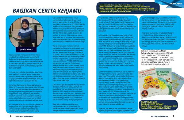 Selamat kepada Avina Noor Rahmadanty Pemenang dari TRIVIA QUIZ : BAGIKAN CERITA KERJAMU Periode 1 Oktober - 1 November 2020 ini mendapatkan hadiah berupa buku karya Ratna Megawangi , Pendiri Indonesia Heritage Foundation !