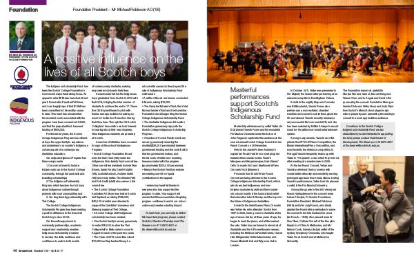 The Indigenous Scholarship Fund has been the Scotch College Foundation’ s most recent major fundraising focus. An appeal to raise $ 5M was launched at last year’ s Foundation President’ s Dinner, and I can happily report that $ 1.5M has been committed to this worthy cause to date. This result has ensured that the recurrent costs associated with the program have been covered until 2020, and that the perpetual fund has seed funding of $ 500,000.