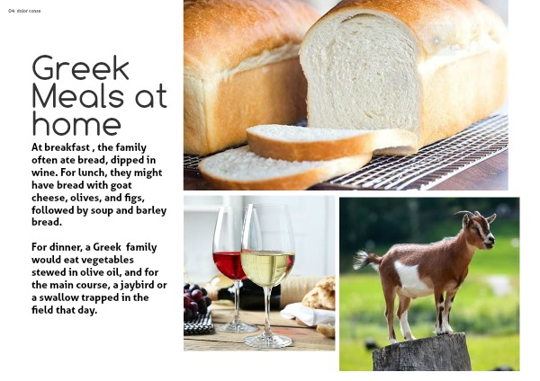 At breakfast , the family often ate bread, dipped in wine. For lunch, they might have bread with goat cheese, olives, and figs, followed by soup and barley bread.