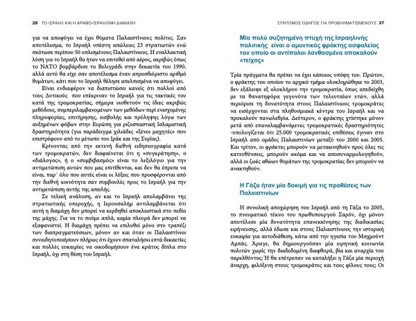Σε τελική ανάλυση , αν και το Ισραήλ απολαμβάνει της στρατιωτικής υπεροχής , η Ιερουσαλήμ αντιλαμβάνεται ότι αυτή η διαμάχη δεν μπορεί να κερδηθεί αποκλειστικά στο πεδίο της μάχης . Για να το πούμε απλά , καμία πλευρά δεν μπορεί να εξαφανιστεί . Η διαμάχη πρέπει να επιλυθεί μόνο στο τραπέζι των διαπραγματεύσεων , μόνον αν και όταν οι Παλαιστίνιοι συνειδητοποιήσουν πλήρως ότι έχουν σπαταλήσει επτά δεκαετίες και πολλές ευκαιρίες να οικοδομήσουν ένα κράτος δίπλα στο Ισραήλ , όχι στη θέση του Ισραήλ .