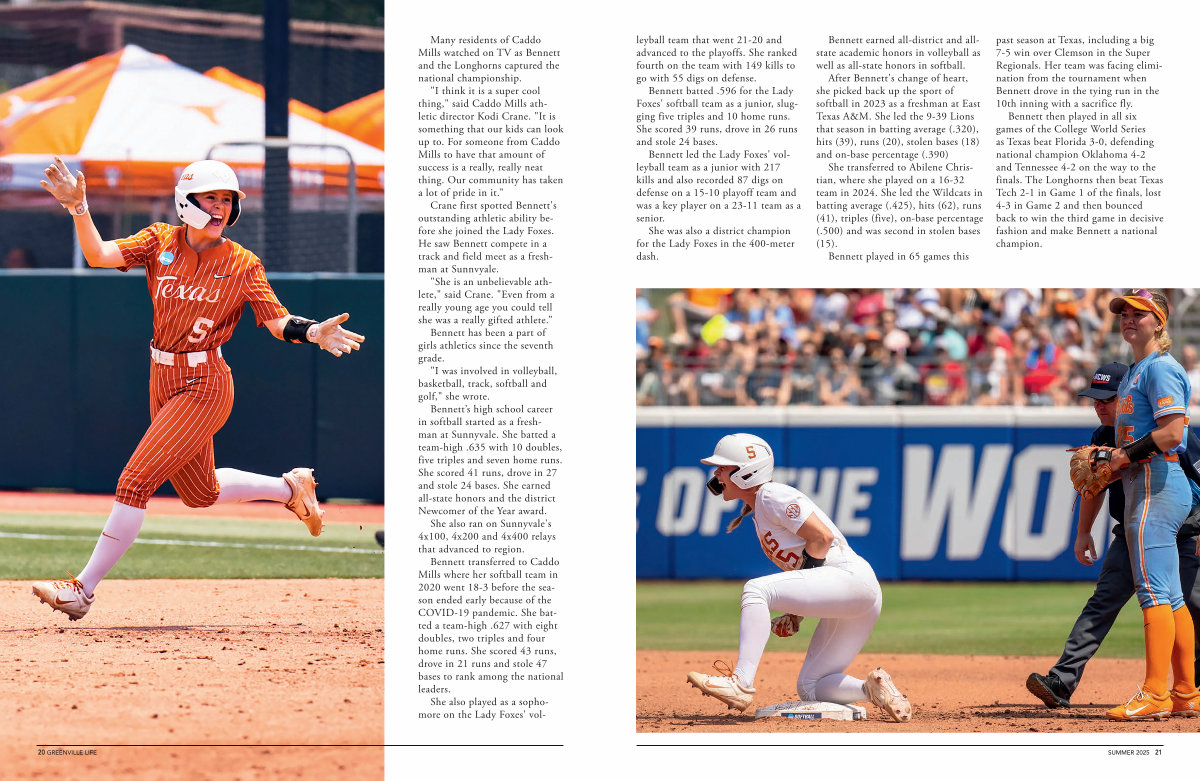 Bennett transferred to Caddo Mills where her softball team in 2020 went 18-3 before the season ended early because of the COVID-19 pandemic. She batted a team-high. 627 with eight doubles, two triples and four home runs. She scored 43 runs, drove in 21 runs and stole 47 bases to rank among the national leaders.