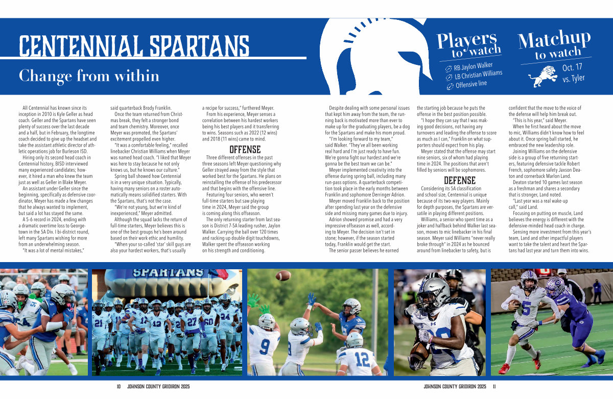 Considering its 5A classification and school size, Centennial is unique because of its two-way players. Mainly for depth purposes, the Spartans are versatile in playing different positions.