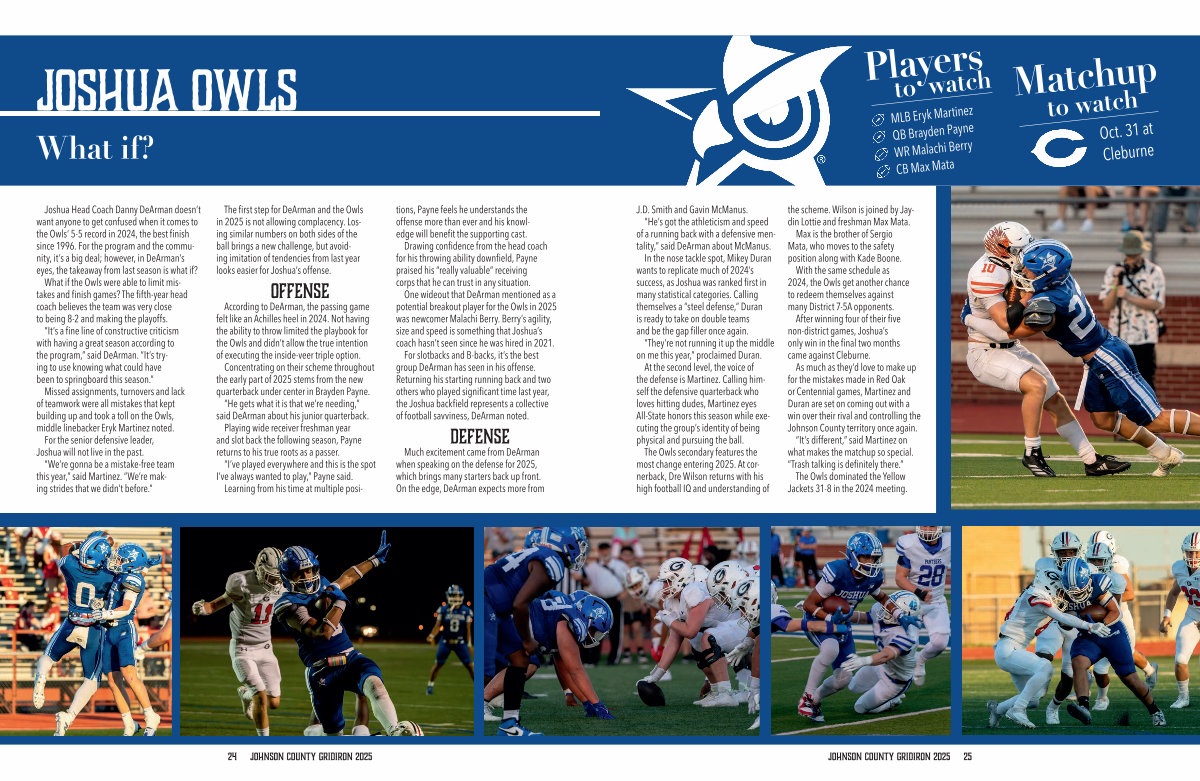 Joshua Head Coach Danny DeArman doesn’ t want anyone to get confused when it comes to the Owls’ 5-5 record in 2024, the best finish since 1996. For the program and the community, it’ s a big deal; however, in DeArman’ s eyes, the takeaway from last season is what if?