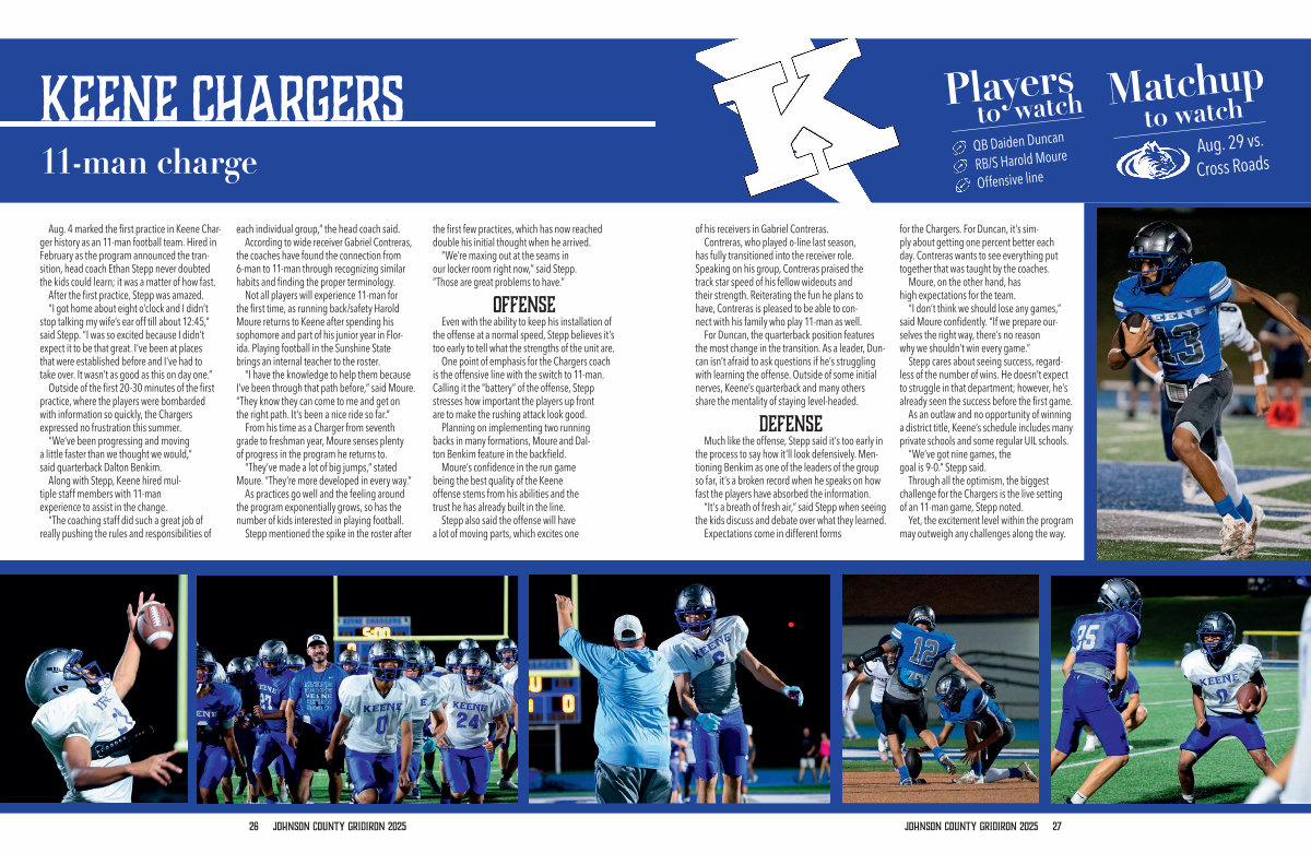 Aug. 4 marked the first practice in Keene Charger history as an 11-man football team. Hired in February as the program announced the transition, head coach Ethan Stepp never doubted the kids could learn; it was a matter of how fast. After the first practice, Stepp was amazed.“ I got home about eight o’ clock and I didn’ t stop talking my wife’ s ear off till about 12:45,” said Stepp.“ I was so excited because I didn’ t expect it to be that great. I’ ve been at places that were established before and I’ ve had to take over. It wasn’ t as good as this on day one.”