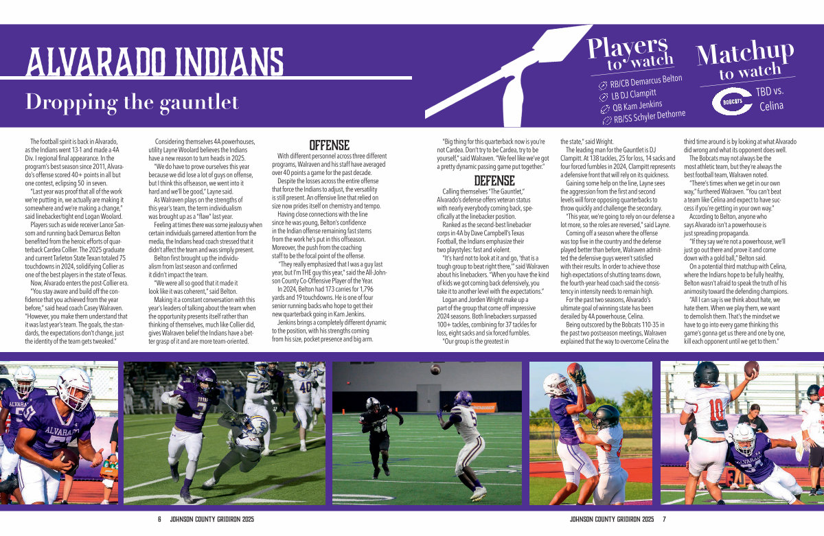 Players such as wide receiver Lance Sansom and running back Demarcus Belton benefited from the heroic efforts of quarterback Cardea Collier. The 2025 graduate and current Tarleton State Texan totaled 75 touchdowns in 2024, solidifying Collier as one of the best players in the state of Texas. Now, Alvarado enters the post-Collier era.“ You stay aware and build off the confidence that you achieved from the year before,” said head coach Casey Walraven.“ However, you make them understand that it was last year’ s team. The goals, the standards, the expectations don’ t change, just the identity of the team gets tweaked.”