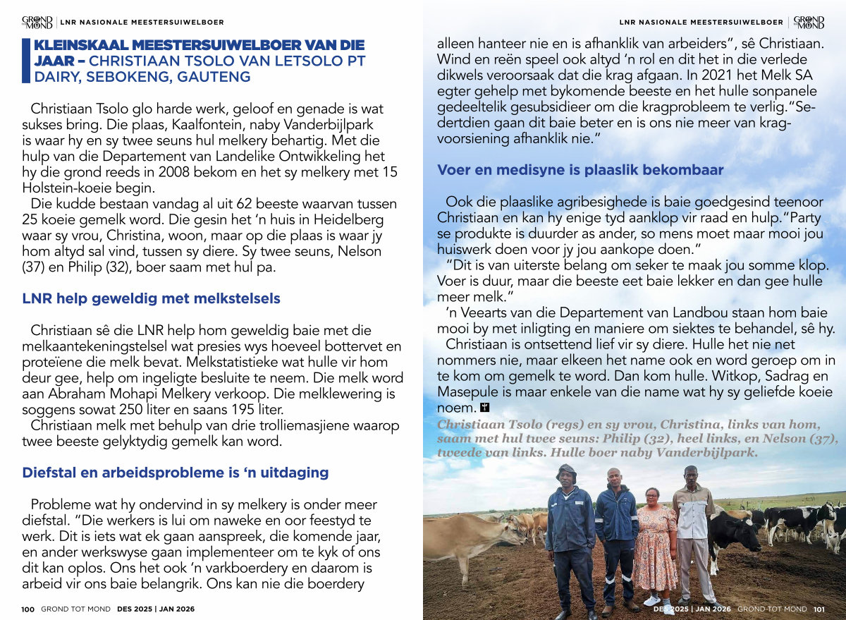 Christiaan Tsolo glo harde werk, geloof en genade is wat sukses bring. Die plaas, Kaalfontein, naby Vanderbijlpark is waar hy en sy twee seuns hul melkery behartig. Met die hulp van die Departement van Landelike Ontwikkeling het hy die grond reeds in 2008 bekom en het sy melkery met 15 Holstein-koeie begin. Die kudde bestaan vandag al uit 62 beeste waarvan tussen 25 koeie gemelk word. Die gesin het‘ n huis in Heidelberg waar sy vrou, Christina, woon, maar op die plaas is waar jy hom altyd sal vind, tussen sy diere. Sy twee seuns, Nelson( 37) en Philip( 32), boer saam met hul pa.