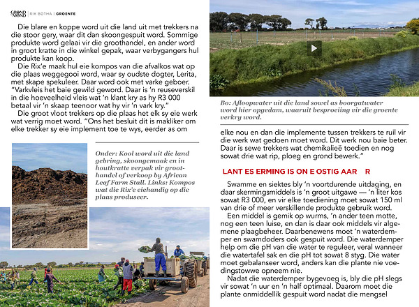 Onder: Kool word uit die land gebring, skoongemaak en in houtkratte verpak vir groothandel of verkoop by African Leaf Farm Stall. Links: Kompos wat die Rix’ e eiehandig op die plaas produseer.