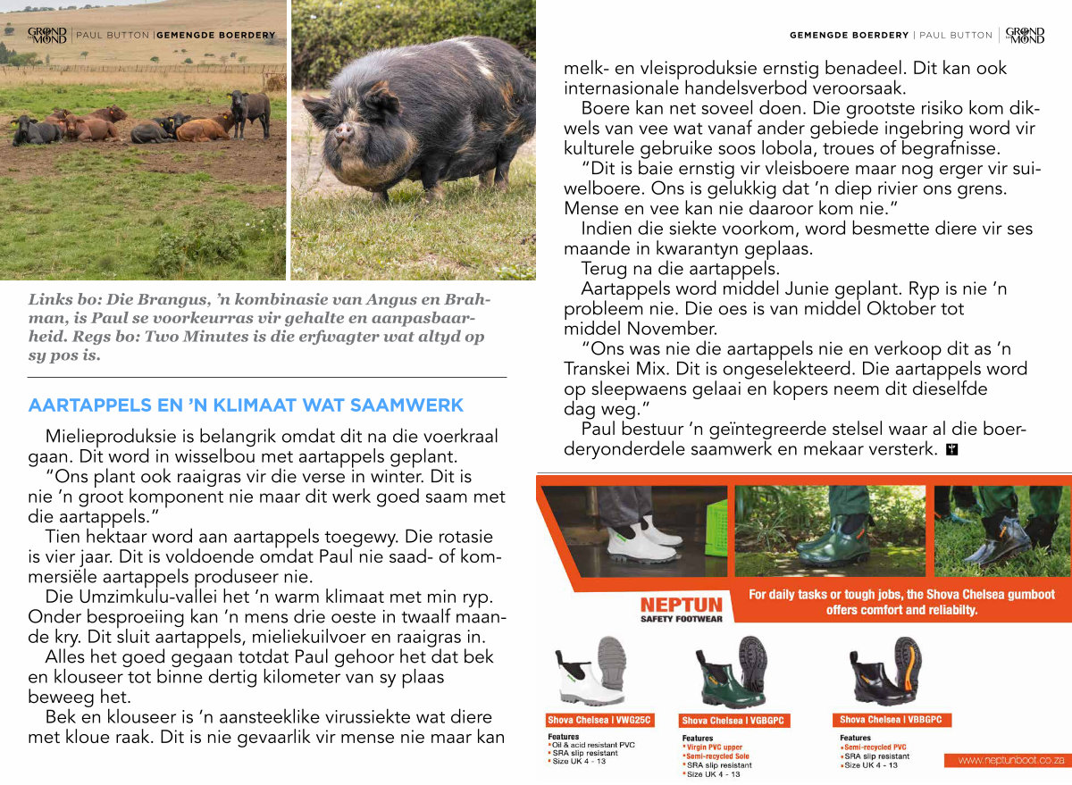 Indien die siekte voorkom, word besmette diere vir ses maande in kwarantyn geplaas. Terug na die aartappels. Aartappels word middel Junie geplant. Ryp is nie’ n probleem nie. Die oes is van middel Oktober tot middel November.