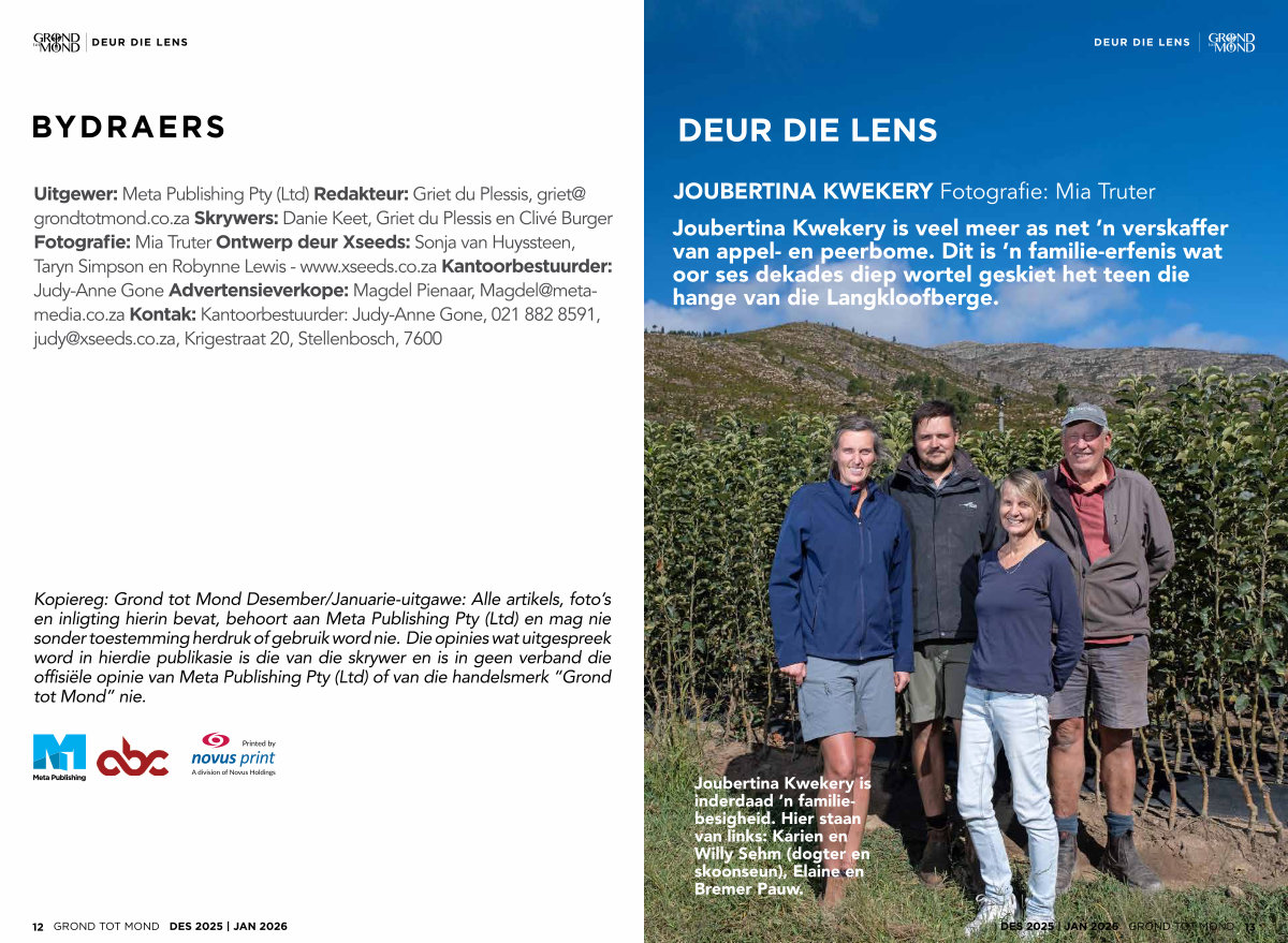 Uitgewer: Meta Publishing Pty( Ltd) Redakteur: Griet du Plessis, griet @ grondtotmond. co. za Skrywers: Danie Keet, Griet du Plessis en Clivé Burger Fotografie: Mia Truter Ontwerp deur Xseeds: Sonja van Huyssteen, Taryn Simpson en Robynne Lewis- www. xseeds. co. za Kantoorbestuurder: Judy-Anne Gone Advertensieverkope: Magdel Pienaar, Magdel @ metamedia. co. za Kontak: Kantoorbestuurder: Judy-Anne Gone, 021 882 8591, judy @ xseeds. co. za, Krigestraat 20, Stellenbosch, 7600