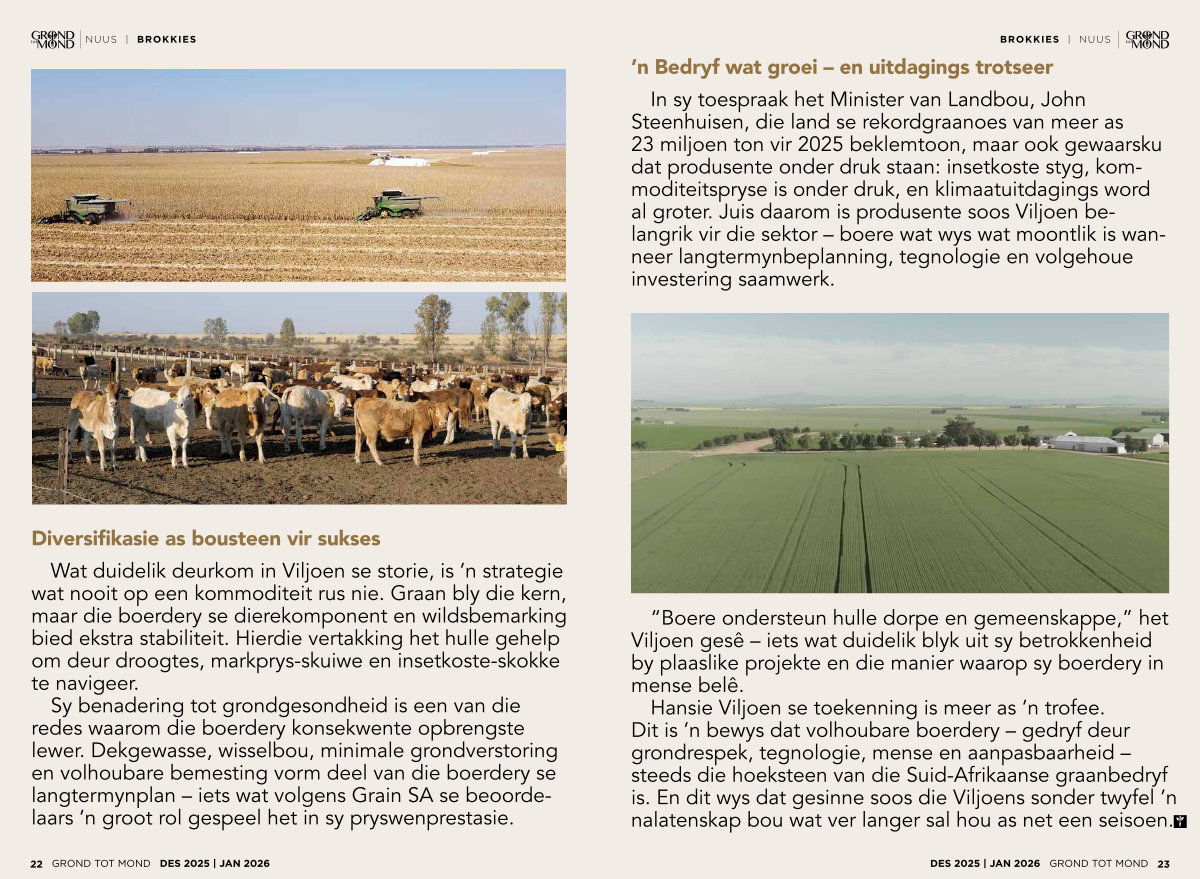 Wat duidelik deurkom in Viljoen se storie, is’ n strategie wat nooit op een kommoditeit rus nie. Graan bly die kern, maar die boerdery se dierekomponent en wildsbemarking bied ekstra stabiliteit. Hierdie vertakking het hulle gehelp om deur droogtes, markprys-skuiwe en insetkoste-skokke te navigeer.