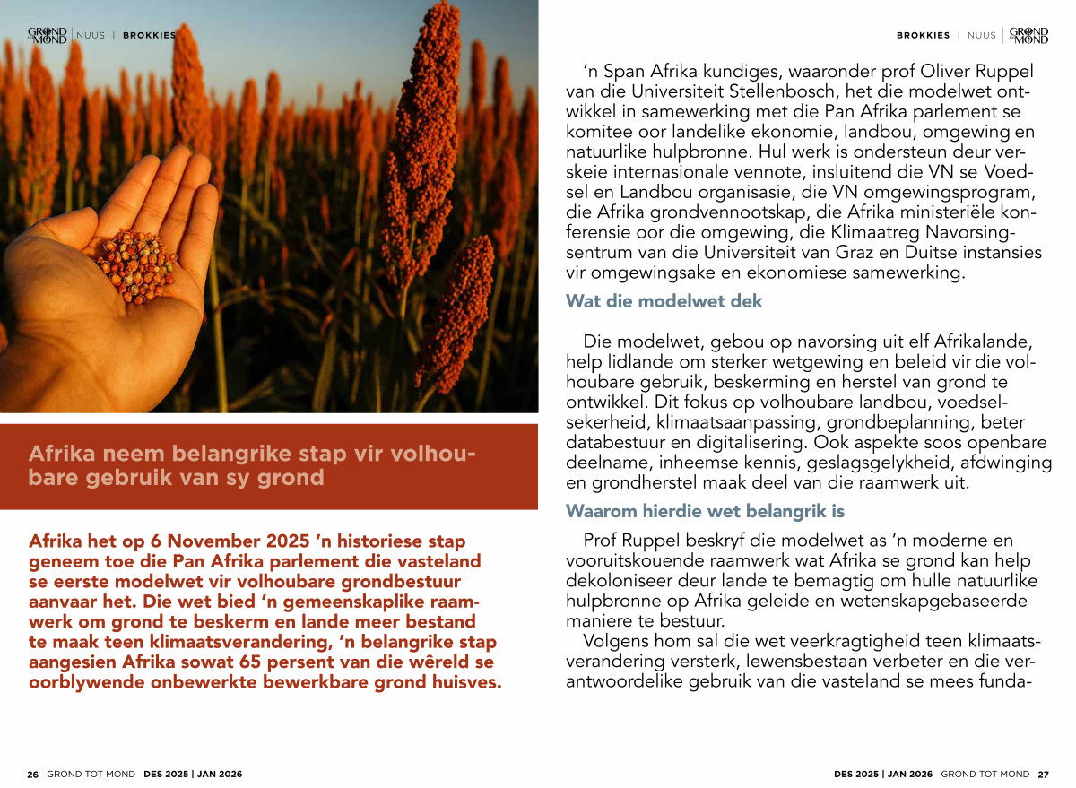 Afrika het op 6 November 2025’ n historiese stap geneem toe die Pan Afrika parlement die vasteland se eerste modelwet vir volhoubare grondbestuur aanvaar het. Die wet bied’ n gemeenskaplike raamwerk om grond te beskerm en lande meer bestand te maak teen klimaatsverandering,’ n belangrike stap aangesien Afrika sowat 65 persent van die wêreld se oorblywende onbewerkte bewerkbare grond huisves.